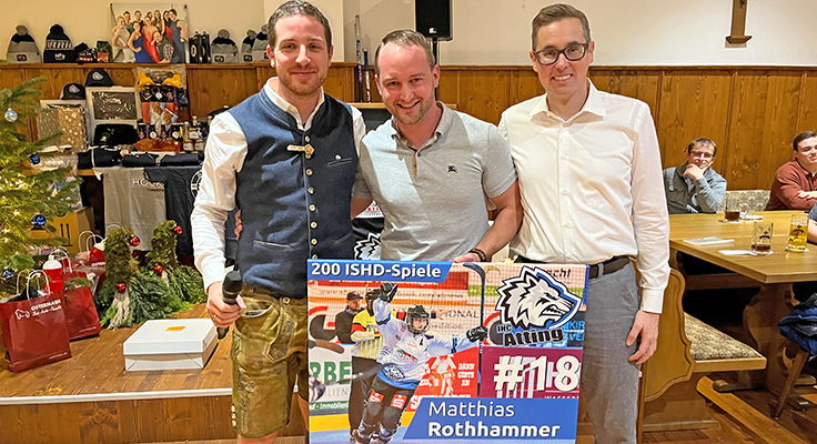 Aber es wird auch Veränderungen zur neuen Saison geben: Christina Koblmüller gibt das Hallenmanagement ab und mit Robert Kuhnle (U10), Maximilian Miazga (U19), Maximilian Kettl (U19) und Matthias Rothhammer (U10) wurden auch vier Trainer verabschiedet, die nun kürzer treten oder pausieren wollen. Rothhammer, eines der Urgesteine des Bundesligateams verkündete zudem das Ende seiner Spielerlaufbahn. Er absolvierte seit 2005 224 Spiele für den IHC (davon 202 in der 1. oder 2. Bundesliga) und kam auf 449 Punkte. Kapitän und Sportvorstand Fabian Hillmeier, wünschte seinem ehemaligen Mitspieler, mit dem „ich viele Schlachten geschlagen habe“ schließlich „alles Gute im Ruhestand“ und dass er auch 2024 bei den Spielen als Zuschauer dabei sein möge. Sein Trikot, das „voraussichtlich“ letzte Spieltrikot wurde danach versteigert – und zwar gleich mit Fanschal. Denn den werde er brauchen, sagte Versteigerer Moritz Eisenschink. Rothhammer wurde ebenso mit großem Applaus der rund 125 Gäste bedacht wie später Herren-Europameister Meichel. Hillmeier kündigte an, dass der Verein nicht nur Rothammer am Rande eines Spiels in der neuen Saison ehren werde, sondern auch weitere ehemalige Spieler in der Halle verewigen wolle.