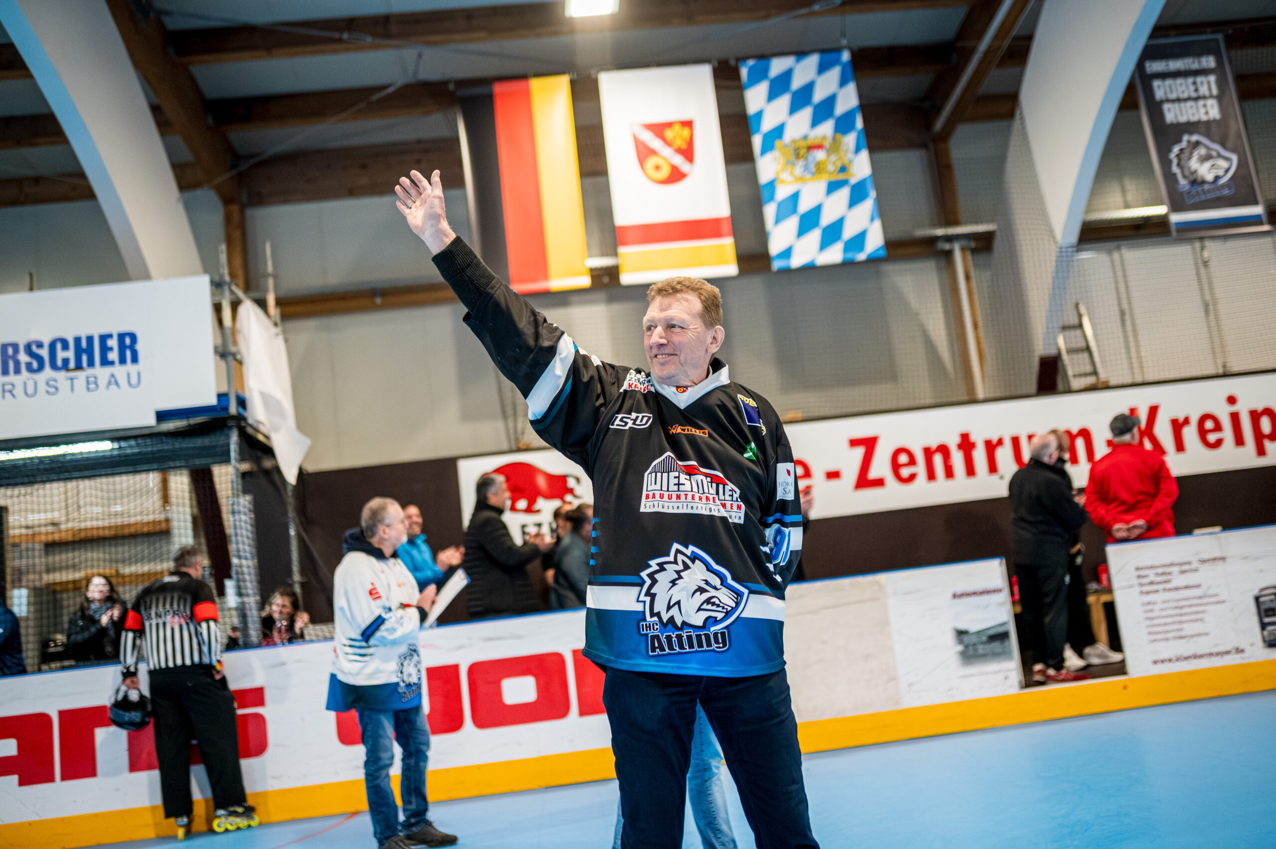 Am Sonntag durfte unser scheidender 1. Bürgermeister Robert Ruber sein letztes Bundesligaspiel seiner 18 Jahre währenden Amtszeit erleben. Der Spielverlauf beim 7:6 nach Penalty-Schießen gegen die Köln Rheinos (3:6-Rückstand nach rund 52 Minuten, Ausgleich zum 6:6 bei 59:59) bot dabei nicht nur wahnsinnig viele Dramatik, sondern auch das passende Ende in Form eines Heimsieges. Ruber wurde vor dem Spiel vom Verein zum Ehrenmitglied ernannt und mit einem Banner in der mt-propeller-arena geehrt.